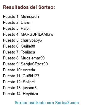 Lista de participantes: Guifiti123, SergioSFzgz90, Melinxadri, MARSUPILAMIaw, Palbi, Tonijaca, Solipei, Mugsiemar99, Heyibiza, Guille88, Eisiem, charlybaby6, enreda, javson5.