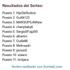 Lista de participantes: Guifiti123, SergioSFzgz90, MARSUPILAMIaw, tonijaca, albertini, Guille88, eisiem, HijoDeRudicio, charlybaby6, javson5, Melinxadri.