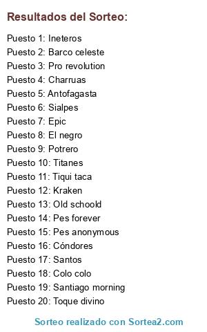 Lista de participantes: Cóndores, Old schoold, Epic, Pro revolution, Barco celeste, Tiqui taca, Sialpes, Pes anonymous, Kraken, Potrero, Toque divino, Antofagasta, El negro, Ineteros, Charruas, Santiago morning, Pes forever, Colo colo, Titanes, Santos.