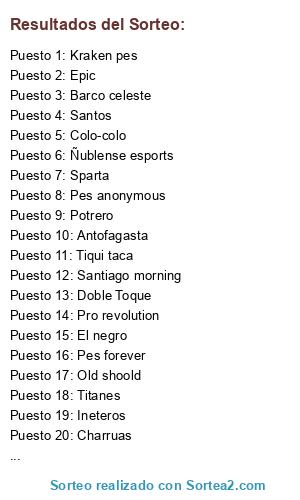 Lista de participantes: Si al pes, Barco celeste, Pes forever, Gladiadores, Titanes, Pro revolution, Colo-colo, Santos, Tiqui taca, Old shoold, Epic, Toque divino, El negro, Sparta, Antofagasta, Santiago morning, Doble Toque, Ineteros, Kraken pes, Potrero, Pes anonymous, Cóndores, Charruas, Ñublense esports.