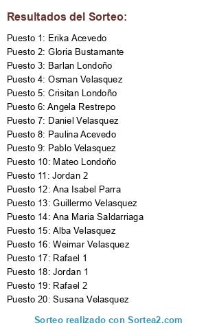 Lista de participantes: Alba Velasquez, Osman Velasquez, Barlan Londoño, Rafael 1, Guillermo Velasquez, Mateo Londoño, Erika Acevedo, Gloria Bustamante, Jordan 2, Pablo Velasquez, Weimar Velasquez, Rafael 2, Crisitan Londoño, Ana Isabel Parra, Angela Restrepo, Paulina Acevedo, Ana Maria Saldarriaga, Daniel Velasquez, Susana Velasquez, Jordan 1.