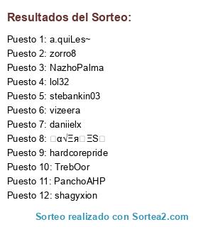 Lista de participantes: stebankin03, felix_rap, NazhoPalma, daniielx, hardcorepride, shagyxion, a.quiLes~, zorro8, ਹα√ΞяძΞSฬ, borisx7, lol32, PanchoAHP, vizeera, TrebOor.