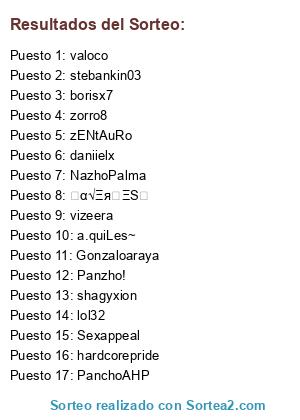 Lista de participantes: zorro8 , daniielx, valoco , ਹα√ΞяძΞSฬ , zENtAuRo, NazhoPalma , Panzho! , shagyxion , vizeera , lol32 , a.quiLes~ , hardcorepride , stebankin03 , borisx7 , PanchoAHP , Sexappeal , Gonzaloaraya.