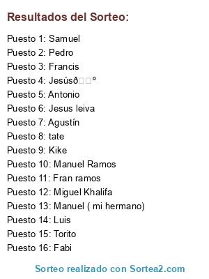 Lista de participantes: Torito, Francis, Manuel ( mi hermano), Samuel, Kike, Luis, Manuel Ramos, Jesús🍺, Fabi, Fran ramos, tate, Pedro, Antonio, Jesus leiva, Miguel Khalifa, Agustín.