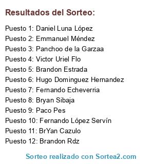 Lista de participantes: Brandon Rdz, Emmanuel Méndez, Victor Uriel Flo, Panchoo de la Garzaa, Fernando Echeverria, Daniel Luna López, Hugo Dominguez Hernandez, Brandon Estrada, Paco Pes, BrYan Cazulo, Bryan Sibaja, Fernando López Servín.