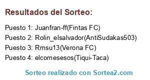Lista de participantes: Rolin_elsalvador(AntiSudakas503), Juanfran-ff(Fintas FC), elcomesesos(Tiqui-Taca), Rmsu13(Verona FC).