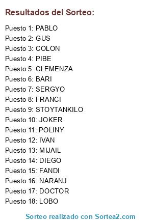 Lista de participantes: PIBE, STOYTANKILO, DOCTOR, LOBO, DIEGO, NARANJ, JOKER, GUS, PABLO, POLINY, MIJAIL, COLON, BARI, IVAN, FANDI, FRANCI, SERGYO, CLEMENZA.
