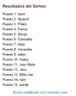 Lista de participantes: Garinaldo, Javo, itam, itsab, Shuya, perejil, Billie Joe, Oscareke, zebin, rijkaard, heasy, Juan Mata, toom, Danza, Pilsén.