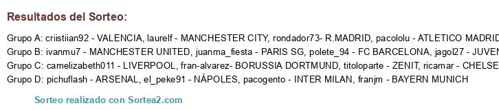 Lista de participantes: rondador73- R.MADRID, polete_94 - FC BARCELONA, juanma_fiesta - PARIS SG, laurelf - MANCHESTER CITY, franjm - BAYERN MUNICH, ivanmu7 - MANCHESTER UNITED, ricamar - CHELSEA, pacololu - ATLETICO MADRID, jagol27 - JUVENTUS, pichuflash - ARSENAL, fran-alvarez- BORUSSIA DORTMUND, titoloparte - ZENIT, criistiian92 - VALENCIA, pacogento - INTER MILAN, camelizabeth011 - LIVERPOOL, el_peke91 - NÁPOLES.