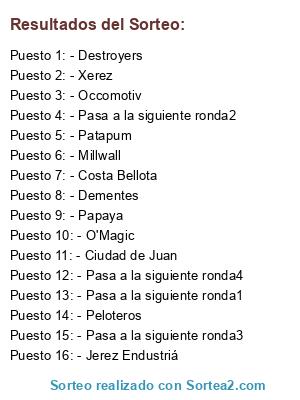 Lista de participantes: - Dementes, - Papaya, - Peloteros, - Millwall, - O'Magic, - Jerez Endustriá, - Costa Bellota, - Destroyers, - Ciudad de Juan, - Patapum, - Xerez, - Occomotiv, - Pasa a la siguiente ronda1, - Pasa a la siguiente ronda2, - Pasa a la siguiente ronda3, - Pasa a la siguiente ronda4.