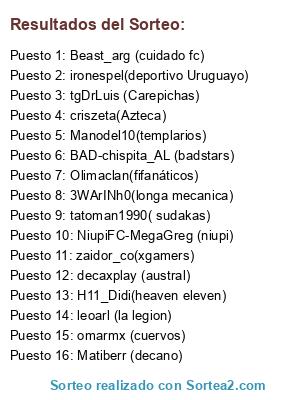 Lista de participantes: criszeta(Azteca), Olimaclan(fifanáticos), 3WArINh0(longa mecanica), tgDrLuis (Carepichas), NiupiFC-MegaGreg (niupi), H11_Didi(heaven eleven), Beast_arg (cuidado fc), Manodel10(templarios), decaxplay (austral), Matiberr (decano), omarmx (cuervos), zaidor_co(xgamers), ironespel(deportivo Uruguayo), leoarl (la legion), tatoman1990( sudakas), BAD-chispita_AL (badstars).