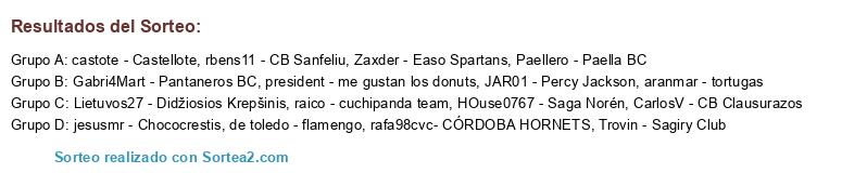 Lista de participantes: rbens11 - CB Sanfeliu, Lietuvos27 - Didžiosios Krepšinis, jesusmr - Chococrestis, aranmar - tortugas, president - me gustan los donuts, rafa98cvc- CÓRDOBA HORNETS, de toledo - flamengo, raico - cuchipanda team, Paellero - Paella BC, Gabri4Mart - Pantaneros BC, JAR01 - Percy Jackson, HOuse0767 - Saga Norén, CarlosV - CB Clausurazos, castote - Castellote, Trovin - Sagiry Club, Zaxder - Easo Spartans.