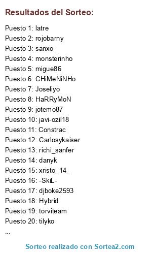 Lista de participantes: 2102, _-CaTa-_, _valin_, adarrec, adrianmaese, adry_talega, Agu_CWM, aguilera--alex, airs18, alban659, albertero, albesa, alejandrozgz, ALFON_91, alicate, ALNA25, alvarito956, angelcop83, Anthony__1989, APOCALIPSIS, assalito, asturjorge98, BaLaGoL, benitosk8, beto_beto_99, Blate-star10, bubo_79, bukanero77, BurfoK, bustammm, cabernicola25, camino88, carlos_1108, carlosbetico, Carlosykaiser, cesarotor, chicharou, CHiMeNiNHo, chiquiteam, cipotti, claudinho10, claudinho10mala, Constrac, cortex, cp1991, Cr7thebest, d4v1d_f3n1x, dacalex, dani_caseria, danielo0o0, danikoso, Danny ss, danyk, davidrs28, davilinho1978, Deiviz, djboke2593, djchicue, DJJcarlos, djsnake, djss_, DomiN, -DRebo-, DUGLASS, egidopau, el7despain, ELPUMA, elreydelpro, erich19, erkobra, faster1988, Flako_jmays, forengas, fredystation, frenxa, frias_01, gandalfiol, glottis, gonpalu, HaRRyMoN, Hybrid, ICG14, IKER 00, Isra_21, J.Robles 21, Javi Pandiani, javi-ozil18, javipocas, Javiruly18, jcarlinho19, jimeninho84, jjla_merengue, joanfcb, joaquinho, JORGE__73, Joseliyo, joselmiro, joselu25, joseraspk, jotemo87, juabillo, juandy1989, juanka_40, juanvi2010, juliusgandalf, Kamaleon1991, kamikace21, kuko78, kurry82, lakylu, latre, lolinhoutrera, lolito22, luis_22, luisiko_elx, lumpa7, macvid, MaKiKiLL, mariony99, marlito, marlitoo, mateyita, maykelillo9, MeeLLii5, MemphisGT, mescamilla, migue86, miguelito_ccy11, mistian11, monsterinho, morpheo27, nachomori24, naruto24, nino_17, NorriS_28, Olibong, oskar16, osvaldiito, Owodjaye82, pablo_brihuega, pabloartista, paco.90, peluco, PiLaCRaZY, piliza, pitu1493, PL-Smolldinho, PL-Superdinho, Puertas80, R10T, rafanaa, ratony18, Raven, richi_sanfer, rimper, Rios_10, rivaltales, Rocabilli, rojobarny, ROLHy, roqueluis, ruperrouba, sanxo, ScOrP1oN, sefirottt, sergidela, sergiosankris, shadow85mlg, Shaitan69, ShelbyGT, Sieg85, sinmote39, Sk0rpio, -SkiL-, snaidej, SOLERA_22, Splass, SuperPucela, tambordelaoje, tengolas3, thexedo89, tilyko, torete33, torviteam, Trammel, TRONKY24, troyano24, Tunkayonki, v1k1ng0rmcf, Vampiro_Night, vicente_el_mas, vichin7, viciado, villapons1, wakandu, xakixan, xino_xinytto, xristo_14_, xXSeVi_STyLeXx, yerburto, Zarra, ZeQuI, Zlatantf.