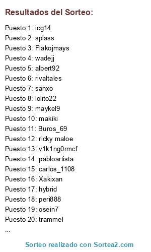 Lista de participantes: 2102, adrianmaese, adry_talega, albert92, alejandrozgz, Alexis Yanes, alicate, alna25, Angelcop83, assalito, Balagol, benitosk8, buho_79, Buros_69, bustam, cabernicola25, camacho4378, carl9200, carlos_1108, carlos_pes, cata, Chenchoka, chimeninho, Cipotti00, cortex, Cule24, dacalex, dani_caseria, dani-demoda, danikoso, david_fenix, davilinho1978, deiviz, djsnake, djss_, DomiN, Drebo, Duglass, egidopau, el7despain, elmakina77, elreydelpro, erkobra, Faster1988, Flakojmays, fran82-, fredystation, Frias_01, Gralleru, Harrymon, hashell, hybrid, icg14, iker-00, imm, isra_21, Javi_bruja88, JBV13, jcarlinho19, jontxu22, Jorge__73, Josepolo, joseraspk, juabiyo, juandy, juanvi2010, kamaleon1991, kamikace21, lacky, lakylu, lluismc11, lolinhoutrera, lolito22, Luis_22, m3n15m, macvid, makiki, makuy, manoduramou, marlito, mateyita, maykel9, memphis_gt, mescamilla, migue86, miguelito_ccy11, mistian11, Norris_28, nostradamus, osein7, osvaldito, Owodjaye82, pabloartista, payasete_jaen, peri888, pichichi_neng, pitu1493, piturz, PL-smolldinho, Pl-superdinho, rafa_matador, rafanaa, raven, rekaspitas, requich, richi_sanfer, ricky maloe, rivaltales, roqueluis, Ruperrouba, santilau, sanxo, sefirott, sergiosankris, sevi_style, shanero, shelby, sinmote39, sk0rpio, Skil, splass, Stoned1, sugerman, tengolas3, torviteam, trammel, troyano, undebel, v1k1ng0rmcf, vichin7, wadejj, wakandu, Xakixan, xristo_14_, xx-Er-Alberto-xx, yerbuto, Zequi, Zizou_tikitaka.