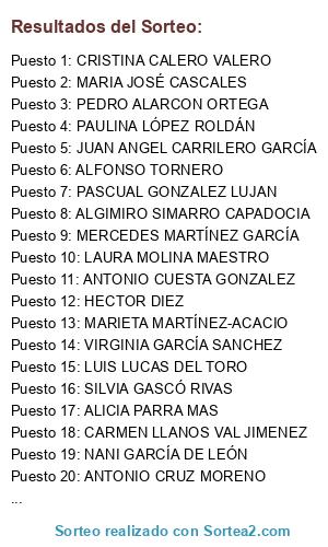 Lista de participantes: JUDIT RIVERO SÁNCHEZ, RAUL MARTÍ DE PAUL, EMILIANO AGUILAR SORIANO, LLANOS CEBRIAN RONCERO, ALGIMIRO SIMARRO CAPADOCIA, FELISA PÉREZ INIESTA, ANA MARIA PÉREZ INIESTA, BIENVENIDO TIERRASECA MONTERO, MARIA SAGRARIO OLIVER MOLINA, MARIA ISABEL ABELLAN, ANTONIO NAHARRO, ILDEFONSO LÓPEZ SÁNCHEZ, MARIA JOSÉ CASCALES, CELIA PINA PICAZO, MIGUEL ANGEL MARTINEZ ALCANTUD, AMPARO ALVAREZ VELASCO, CARMEN LLANOS VAL JIMENEZ, NANI GARCÍA DE LEÓN, ALICIA PARRA MAS, MARIETA MARTÍNEZ-ACACIO, LUIS LUCAS DEL TORO, MARÍA SANCHEZ TOLEDO, DIEGO DE SOUZA, EDUARDO CUENCA SERNA, MIGUEL ANGEL ALBAL, VIRGINIA GARCÍA SANCHEZ, MARÍA CUESTA PÉREZ, ANTONIO CRUZ MORENO, ANTONIO CUESTA GONZALEZ, MARIA ANGELES PÉREZ RODRIGUEZ DE VERA, BRUNO ORTEGA MARTÍNEZ, PEDRO ALARCON ORTEGA, PEDRO ALCORCON OLIVER, NESTOR LLORET RODRIGUEZ, BLANCA TORNERO, IMANOL FERNANDEZ-CASTAÑEDA, ALFONSO TORNERO, ADOLFO DÍAZ, SILVIA GASCÓ RIVAS, MIGUEL SIMÓN GARCÍA, PILAR DE LA ROSA AGUILAR, CARMEN COLLADO GARCÍA, LUIS TEBAR GARCÍA, MILAGROS VÁZQUEZ TORRES, MARI CARMEN SAIZ MESA, JUAN ANGEL CARRILERO GARCÍA, ANTONIO CARBONEL DÍAZ, BEATRIZ ABAD CARRASCOSA, URBANO MUÑOZ SÁNCHEZ, FRANCISCO TENDERO MOLINA, GLORIA CAMACHO BARRIOS, JULIO TARANCÓN BINUESA, DOLOREZ SANCHEZ LOPEZ, CRISTINA CALERO VALERO, EVA PANADERO, PAQUI PANADERO AGUILAR, ARANCHA PANAERO AGUILAR, MERCEDES MARTÍNEZ GARCÍA, ENCARNA PÉREZ MARTÍNEZ, MARI SOL PIÑERO, HECTOR DIEZ, PASCUAL GONZALEZ LUJAN, JASUS SEMPERE RICO, MARI CARMEN DONCEL LINARES, ÁNGELA MARTÍNEZ HELLÍN, CESAR ARRANZ, LAURA MOLINA MAESTRO, FRANCISCO MARTÍNEZ AUÑÓN, RUBÉN GIL RUIZ, VICTOR VALENCIA DOMÍNGUEZ, MIRIAM GONZÁLEZ GONZÁLEZ, PAULINA LÓPEZ ROLDÁN, GABRIEL QUINTANILLA MARTÍNEZ, ALBERTO GÓMEZ CAÑADA, USE CAÑAVERAS PEREA, MABEL RODRIGUEZ VERA, PEDRO ANGEL ROYO GIL, JUAN TOLOSA BARRILERO, ANGELA GARCÍA ALAMINOS, ALVARO DE MIGUEL.