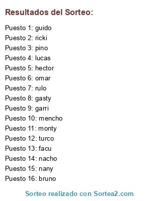 Lista de participantes: nany, turco, ricki, rulo, monty, pino, gasty, facu, nacho, mencho, omar, guido, bruno, hector, garri, lucas.