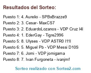 Lista de participantes: 1. EderGay - Tigre2996, 2. EduardoLozanos - VDP Cruz l4l, 3. Cesar- MaxCS7, 4. Aurelio - SPBxBrazze9, 5. Miguel Pb - VDP Messi D10S, 6. Jomi - VDP jomigama, 7. Ivan Furgoneta - ivanjmf, 8. Ulyses - VDP ASTR0 l11l.