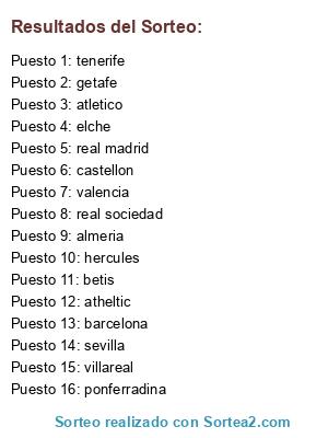 Lista de participantes: almeria, getafe, valencia, real madrid, barcelona, villareal, sevilla, atletico, atheltic, real sociedad, betis, tenerife, ponferradina, castellon, elche, hercules.