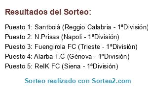 Lista de participantes: Alarba F.C (Génova - 1ªDivisión), ReIK FC (Siena - 1ªDivisión), N.Prisas (Napoli - 1ªDivisión), Fuengirola FC (Trieste - 1ªDivisión), Santboià (Reggio Calabria - 1ªDivisión).