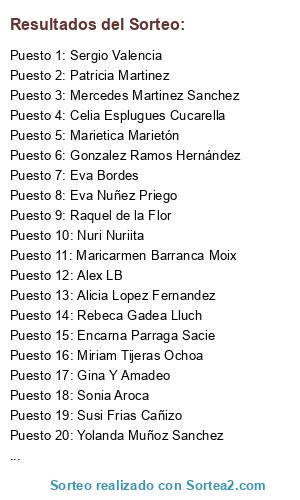 Lista de participantes: Chelo Montero, María Dolores Hernández Luis, Carmen García Coba, Rebeca Gadea Lluch, Ana Maria Morant, Miriam Tijeras Ochoa, Verónica García Gimeno, Edgar BP, Marta Esteban, Syl GA, Marina Pastor Pardo, Erick Ribera Solis, Amparo Giner Mondragón, Mabel Rivero, Pili Chisbert Nohales, Asun Gabaldón Sánchez, Veronica RC, Eva López Caballero, Eva Nuñez Priego, Lorac Sanva, Monti Vert, Elena Pérez Castellá, Jorgelina Betiana Corzo, Silvia GA, Natalia Beato Martin, Rafa Amador, Sheila Gradilla Lopez, Raquel de la Flor, Laura Barbero Igualada, Carla Fabuel Fernandez, Jess Cabañero, Alex LB, Isabel María Barriga Perez, Maricarmen Barranca Moix, Maria Dolores Mocholi Fenollosa, Beatriz Marta Martínez López, Margarita Piñero Camacho, Yago López, Lorena Dominguez, Laura Alvarez, Eugenia Hernández, Sonia Garcia Perez, Alba Diacosta, Arito Castro, Gonzalez Ramos Hernández, Kane Rebecca, Anna Sansano, Yanelys Guerra Sanchis, Eloisa Sanchez Fernandez, Anna Guillot, Maria Rama Ortiz, Laura Maria, Sergio Valencia, Ana Roig Gomez, Diana Gin, Patricia Ferrer Pousa, Yoli Js, Estela Dacar, Sandra Garcia Ibañez, Lourdes Gar, Sonia Aroca, Amparo Huerta Ros, Encarna Parraga Sacie, Alba Girz, Laya Torres, Anna Terral, Cristina Bolsas Papelytela, Marta AC, Maria Lpz, Dunia Dieguez, M Carmen Calvo Avila, Ana Isabel Pedrero Alvarez, Noemi Gandia, Sara Lorenzo García, Eva Jimenez, Marietica Marietón, Amanda Belenguer Cotaina, Silvia Garcia Pons, Tamara Picó Calvo, Susi Frias Cañizo, Cristina Cnm, Rosa Galán, Gina Y Amadeo, Amanecer Gomez, Maria Jesus Gutierrez, Noelia Díaz, Blan Quita Abadia, Noe SN, Elo Garcia Celda, Yaiza Y Chemaria Y Dylan, Anna Hidalgo Carbonell, Mercedes Martinez Sanchez, Belinda García Raga, Pilar Guillen, Irene Garcia Ibañez, Luisa Fernanda Mas Aliño, Celia Esplugues Cucarella, Maribel Server Rovira, Lara Rodriguez Palomar, Nuri Nuriita, Camila Strudel, RM Brenda, Marta Lara, Marilia Ledesma, Elena Capella Reig, Christian Jedidias Carpena Ibañez, Verónica Pinto Organ, Marus Alvaredo, Irene Mtnz, Alicia Lopez Fernandez, Vane Requejo, Tony Ortiz, Laura Gándara Nogués, James AR, Gonzalo Monterde, Vanessa Herrero, Rosario López Dominguez, Carolina Llobet Roig, Irene Gonzalez, Nati Nati, Paqui Alija Dominguez, Ana Pau, Sabrina M.Carmona, Ana Bupo, María José González Sánchez, Nene Benegas, Seyla Hernandez Barbera, Xelo Chanel Prada, Yolanda Muñoz Sanchez, Lorena Amai Eldar, Raquel Martinez, Karina Gutierrez Rodriguez, Ana Maria, Inma Romero Picazo, Patricia Martinez, Ana Miguel, Amparo Peris, Jennifer Salcedo Llorens, Eva Bordes, Yaiza Mas, Vero Luque Arenas, Veronica MH, Encarna Marí Fontestad, María Mtnez, Almudena Abellan Puche, Arantxa Carbonell, Unai Bertol Garrido, Trini Collado, Angela MH, Marta Imm, Tamara Martinez Estebanez, Gloria Forner, Carol Casamitjana, Laura Pavía Calabuig, Resti Calabuig, Vlc H Montero, Cristina Peiró Cabrera, Angela HM, Jessica Soria, Maria Domenech.