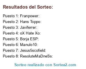 Lista de participantes: Borja ESP: , oX Hate Xo: , Franpower: , Javiferrer: , Manulo10: , Jesus5scofield: , Hans Toppo: , ResoluteMaDneSs:.