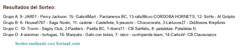 Lista de participantes: rbens11 - CB Sanfeliu, Paellero - Paella BC, Lietuvos27 - Didžiosios Krepšinis, aranmar - tortugas, jesusmr - Chococrestis, House0767 - Saga Norén, raico - cuchipanda team, pataletas- Pataletas.fc, JAR01 - Percy Jackson, Trovin - Sagiry Club, castote - Castellote, SoHo - Al Golpito, rafa98cvc-CORDOBA HORNETS, CarlosV- CB Clausurazos, Gabri4Mart - Pantaneros BC, Marqués - Gato con botas.