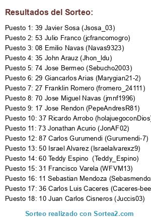 Lista de participantes: 78 Jose Garcia (Gabu199024), 84 Christian Vera (Cmarcelo93_), 61 Xavier Baculima (El_TwistO), 43 Alvaro Sanchez (Lilactico23), 75 Daniel Castro (daniel23cv), 16 Nacho Gallegos (Nachogallegos), 28 Roberto Lainez (Primex79), 88 Jaime de la Cuadra (JdlaCuadra), 90 Adolfo Muñoz (JoseAdolfo28), 91 Nicolas Delgado (Nicodm2003), 92 Alejandro Cuenca (ale2187_05), 65 David Saa (KonquerorDS), 83 Kristian Espinoza (Ilegal), 13 Cristobal Bazaes (Crtobal), 94 Julian Miño (Juliancitomg).