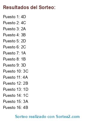 Lista de participantes: 1A, 2A, 3A, 4A, 1B, 2B, 3B, 4B, 1C, 2C, 3C, 4C, 1D, 2D, 3D, 4D.