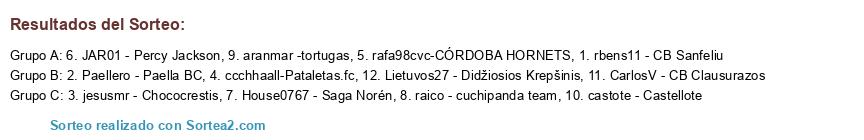 Lista de participantes: 1. rbens11 - CB Sanfeliu, 2. Paellero - Paella BC, 3. jesusmr - Chococrestis, 4. ccchhaall-Pataletas.fc, 5. rafa98cvc-CÓRDOBA HORNETS, 6. JAR01 - Percy Jackson, 7. House0767 - Saga Norén, 8. raico - cuchipanda team, 9. aranmar -tortugas, 10. castote - Castellote, 11. CarlosV - CB Clausurazos, 12. Lietuvos27 - Didžiosios Krepšinis.