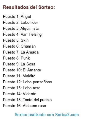Lista de participantes: Lobo lider, Chamán, Lobo ponzoñoso, Lobo raso, Van Helsing, Vidente, Ángel, El Amante, La Amada, Alquimista, Maldito, Aldeano raso, Skin, Punk, Tonto del pueblo, La Sosa.
