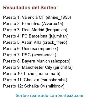 Lista de participantes: PSG (acostabaek), Udinese (mpombix), Lazio (jaume-marti), Bayern Munich (alexpozo), Aston Villa (crack_fifero), Real Madrid (lenguasco), FC Barcelona (jujumirah), Manchester City (pirichififa), Valencia CF (etnies_1993), Chelsea (carlosbomba), Schalke 04 (miklotov), Fiorentina (Alvaroo15).