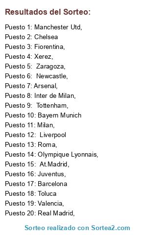 Lista de participantes: Liverpool, Barcelona, Toluca, Chelsea, Olympique Lyonnais, , Milan,, Newcastle, , Juventus, , Manchester Utd,, At.Madrid, , Roma, , Arsenal, , Inter de Milan, , Real Madrid, , Xerez, , Valencia,, Tottenham, , Fiorentina,, Zaragoza, , Bayern Munich.
