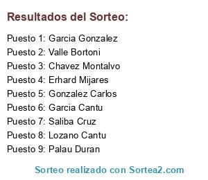Lista de participantes: Chavez Montalvo, Erhard Mijares, Garcia Cantu, Garcia Gonzalez, Gonzalez Carlos, Lozano Cantu, Palau Duran, Saliba Cruz, Valle Bortoni.