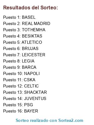 Lista de participantes: BASEL, PSG, BESIKTAS, NAPOLI, CELTIC, BARCA, BAYER, TOTHEMHA, ATLETICO, LEGIA, BRUJAS, REAL MADRID, JUVENTUS, CSKA, LEICESTER, SHACKTAR.