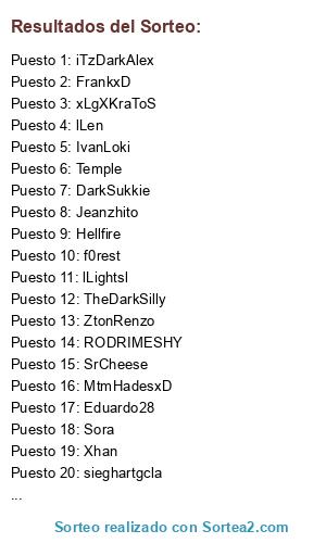 Lista de participantes: MtmHadesxD, MisticoStyle, f0rest, uloyaco, lLightsl, realg4lifee, sieghartgcla, SeoRupert, DarkSukkie, Temple, In0rI, Xhan, IvanLoki, Hellfire, Sora, ZtonRenzo, lLen, TheDarkSilly, EsChuUsMiIB, xLgXKraToS, DeuXeNoaHs, KickeN, iTzDarkAlex, FrankxD, OnlyMe, SrCheese, Eduardo28, Jeanzhito, DarkCastel, PepusPx, RODRIMESHY, RioLeva.