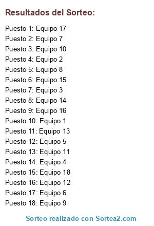 Lista de participantes: Equipo 1, Equipo 2, Equipo 3, Equipo 4, Equipo 5, Equipo 6, Equipo 7, Equipo 8, Equipo 9, Equipo 10, Equipo 11, Equipo 12, Equipo 13, Equipo 14, Equipo 15, Equipo 16, Equipo 17, Equipo 18.