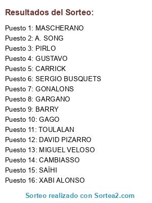 Lista de participantes: XABI ALONSO, CAMBIASSO, DE ROSSI, FELIPE MELLO, THIAGO MOTTA, DAVID PIZARRO, TORE YAYA, PEDRETTI, TOULALAN , VAN BOMEL, .