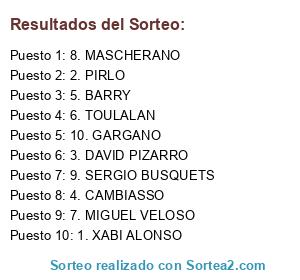 Lista de participantes: 1. XABI ALONSO, 2. PIRLO, 3. DAVID PIZARRO, 4. CAMBIASSO, 5. BARRY, 6. TOULALAN, 7. MIGUEL VELOSO, 8. MASCHERANO, 9. SERGIO BUSQUETS, 10. GARGANO.
