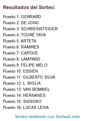 Lista de participantes: CAPOUE, L. BIGLIA, GILBERTO SILVA, DE JONG, GERRARD, FELIPE MELO, TOURÉ YAYA, SCHWEINSTEIGER, LAMPARD, VAN BOMMEL, ESSIEN, LUCAS LEIVA, RAMIRES, SISSOKO, ARTETA, HERNANES, .