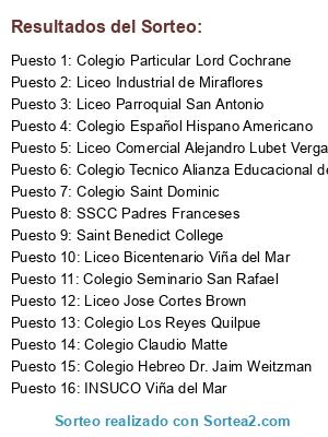 Lista de participantes: Liceo Bicentenario Viña del Mar, Liceo Industrial de Miraflores, Saint Benedict College, Liceo Parroquial San Antonio, Colegio Claudio Matte, Liceo Jose Cortes Brown, Colegio Español Hispano Americano, INSUCO Viña del Mar, Colegio Particular Lord Cochrane, Colegio Saint Dominic, SSCC Padres Franceses, Colegio Seminario San Rafael, Colegio Hebreo Dr. Jaim Weitzman, Liceo Comercial Alejandro Lubet Vergara, Colegio Los Reyes Quilpue, Colegio Tecnico Alianza Educacional de Limache.