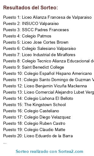 Lista de participantes: Liceo Benjamin Vicuña Mackenna, Liceo Industrial de Miraflores, Colegio Casteliano, Saint Benedict College, The Kingstown School, Liceo Parroquial San Antonio, Colegio Claudio Matte, Liceo Jose Cortes Brown, Colegio Español Hispano Americano, Colegio Ruben Castro, Colegio Diego Velazquez, INSUCO Viña del Mar, Liceo Alianza Francesa de Valparaiso, Colegio Patmos, Colegio Particular Lord Cochrane, SSCC Monjas Francesas, SSCC Padres Franceses, INSUCO Valparaiso, Liceo Eduardo de la Barra, Colegio Santo Domingo de Guzman Valparaiso, Colegio Salesiano Valparaiso, Liceo Comercial Alejandro Lubet Vergara, Colegio Liahona El Belloto, Colegio Tecnico Alianza Educacional de Limache.