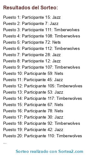Lista de participantes: Participante 1: Jazz, Participante 2: Jazz, Participante 3: Jazz, Participante 4: Jazz, Participante 5: Jazz, Participante 6: Jazz, Participante 7: Jazz, Participante 8: Jazz, Participante 9: Jazz, Participante 10: Jazz, Participante 11: Jazz, Participante 12: Jazz, Participante 13: Jazz, Participante 14: Jazz, Participante 15: Jazz, Participante 16: Jazz, Participante 17: Jazz, Participante 18: Jazz, Participante 19: Jazz, Participante 20: Jazz, Participante 21: Jazz, Participante 22: Jazz, Participante 23: Jazz, Participante 24: Jazz, Participante 25: Jazz, Participante 26: Jazz, Participante 27: Jazz, Participante 28: Jazz, Participante 29: Jazz, Participante 30: Jazz, Participante 31: Jazz, Participante 32: Jazz, Participante 33: Jazz, Participante 34: Jazz, Participante 35: Jazz, Participante 36: Jazz, Participante 37: Jazz, Participante 38: Jazz, Participante 39: Jazz, Participante 40: Jazz, Participante 41: Jazz, Participante 42: Jazz, Participante 43: Jazz, Participante 44: Jazz, Participante 45: Jazz, Participante 46: Jazz, Participante 47: Jazz, Participante 48: Jazz, Participante 49: Jazz, Participante 50: Jazz, Participante 51: Jazz, Participante 52: Jazz, Participante 53: Jazz, Participante 54: Jazz, Participante 55: Nets, Participante 56: Nets, Participante 57: Nets, Participante 58: Nets, Participante 59: Nets, Participante 60: Nets, Participante 61: Nets, Participante 62: Nets, Participante 63: Nets, Participante 64: Nets, Participante 65: Nets, Participante 66: Nets, Participante 67: Nets, Participante 68: Nets, Participante 69: Nets, Participante 70: Nets, Participante 71: Nets, Participante 72: Nets, Participante 73: Nets, Participante 74: Nets, Participante 75: Nets, Participante 76: Nets, Participante 77: Nets, Participante 78: Nets, Participante 79: Nets, Participante 80: Timberwolves, Participante 81: Timberwolves, Participante 82: Timberwolves, Participante 83: Timberwolves, Participante 84: Timberwolves, Participante 85: Timberwolves, Participante 86: Timberwolves, Participante 87: Timberwolves, Participante 88: Timberwolves, Participante 89: Timberwolves, Participante 90: Timberwolves, Participante 91: Timberwolves, Participante 92: Timberwolves, Participante 93: Timberwolves, Participante 94: Timberwolves, Participante 95: Timberwolves, Participante 96: Timberwolves, Participante 97: Timberwolves, Participante 98: Timberwolves, Participante 99: Timberwolves, Participante 100: Timberwolves, Participante 101: Timberwolves, Participante 102: Timberwolves, Participante 103: Timberwolves, Participante 104: Timberwolves, Participante 105: Timberwolves, Participante 106: Timberwolves, Participante 107: Timberwolves, Participante 108: Timberwolves, Participante 109: Timberwolves, Participante 110: Timberwolves, Participante 111: Timberwolves, Participante 112: Timberwolves, Participante 113: Timberwolves, Participante 114: Timberwolves, Participante 115: Timberwolves, Participante 116: Timberwolves, Participante 117: Timberwolves, Participante 118: Timberwolves, Participante 119: Timberwolves, Participante 120: Timberwolves, Participante 121: Timberwolves, Participante 122: Timberwolves, Participante 123: Timberwolves, Participante 124: Timberwolves, Participante 125: Timberwolves, Participante 126: Timberwolves, Participante 127: Timberwolves, Participante 128: Timberwolves, Participante 129: Timberwolves, Participante 130: Timberwolves, Participante 131: Timberwolves, Participante 132: Timberwolves, Participante 133: Timberwolves, Participante 134: Timberwolves, Participante 135: Timberwolves.