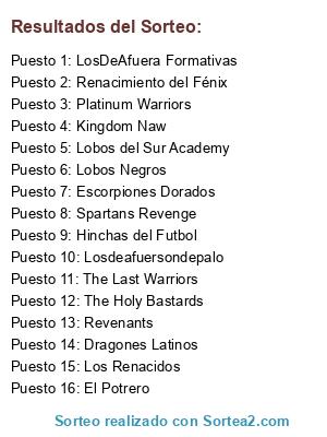 Lista de participantes: The Last Warriors, Spartans Revenge, Hinchas del Futbol, Kingdom Naw, Escorpiones Dorados, LosDeAfuera Formativas, Lobos Negros, Revenants, Los Renacidos, Lobos del Sur Academy, Losdeafuersondepalo, Dragones Latinos, Renacimiento del Fénix, El Potrero, The Holy Bastards, Platinum Warriors.