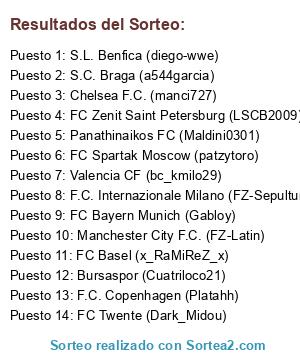 Lista de participantes: F.C. Internazionale Milano (FZ-Sepultura), FC Twente (Dark_Midou), S.L. Benfica (diego-wwe), Manchester City F.C. (FZ-Latin), Valencia CF (bc_kmilo29), Bursaspor (Cuatriloco21), F.C. Copenhagen (Platahh), Panathinaikos FC (Maldini0301), FC Basel (x_RaMiReZ_x), FC Bayern Munich (Gabloy), Chelsea F.C. (manci727), FC Spartak Moscow (patzytoro), FC Zenit Saint Petersburg (LSCB2009), S.C. Braga (a544garcia).