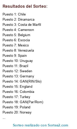Lista de participantes: Spain, Germany, Brazil, Italy, England, Argentina, France, Portugal, Netherlands, Belgium, Uruguay, Russia, Cameroon, Costa de Marfil, Sweden, Colombia, Turkey, Switzerland, Poland, Mexico, Chile, Norway, GAN(Par/Rom), USA, Bulgaria, Venezuela, Escocia, Dinamarca, GAN(RIN/Slo), Rep.Checa, Austria, Korea.