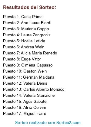Lista de participantes: Andrea Wein, German Maidana, Valeria Denis, Gimena Capasso, Mariana Coppo, Carla Primc, Agus Sabaté, Alina Cervini, Alicia Maria Renedo, Valeria Stanzione, Noelia Leticia, Ana Laura Biordi, Gaston Wein, Laura Zangroniz, Miguel Farré, Euge Vittor, Carlos Alberto Monaco.