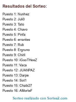 Lista de participantes: iGooTHeeZ, Nunhez, Vaca, JUANPAZ, errantes, Chirli, AMorteF, Juli0, Rub, Tato, Chavo, Pinfa, Ergruno, Darpe, Sot1, Chabi27.