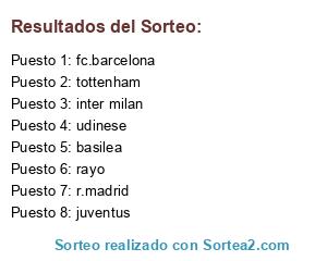 Lista de participantes: juventus, tottenham, rayo, udinese, fc.barcelona, inter milan, basilea, r.madrid.