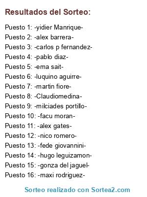 Lista de participantes: -carlos p fernandez-, -pablo diaz-, -yidier Manrique-, -Claudiomedina-, -maxi rodriguez-, -luquino aguirre-, -nico romero-, -milciades portillo-, -martin fiore-, -fede giovannini-, -ema sait-, -facu moran-, -alex barrera-, -alex gates-, -hugo leguizamon-, -gonza del jaguel-.