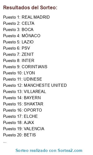 Lista de participantes: BARÇA, REAL MADRID, MANCHESTE UNITED, ATLÉTICO DE MADRID, VALENCIA, INTER, MÁLAGA, BETIS, AJAX, BAYERN, LAZIO, CORINTIANS, ALMERIA, SHAKTAR, BOCA, LYON, ZENIT, VILLAREAL, OPORTO, JUVENTUS, UDINESE, PSV, MÓNACO, CELTA, ELCHE, CITY.